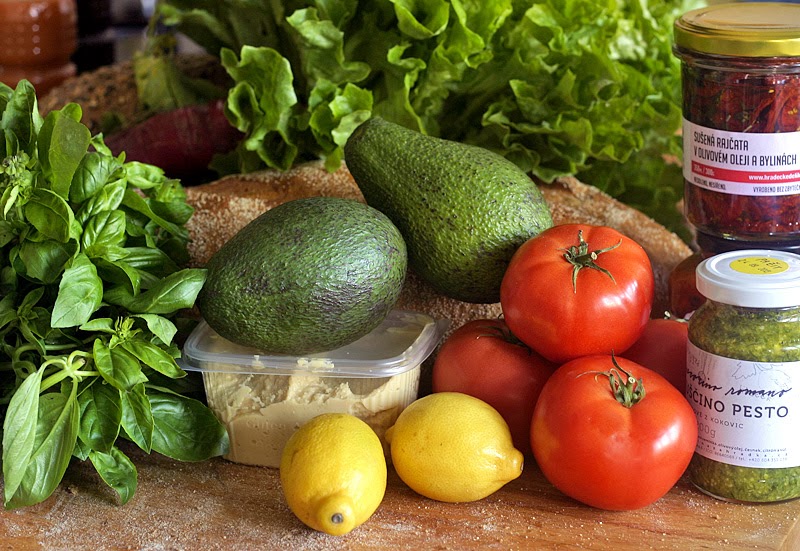 Sendvič s Rajčatovo-Bazalkovým Pestem, Hummusem a Avokádem