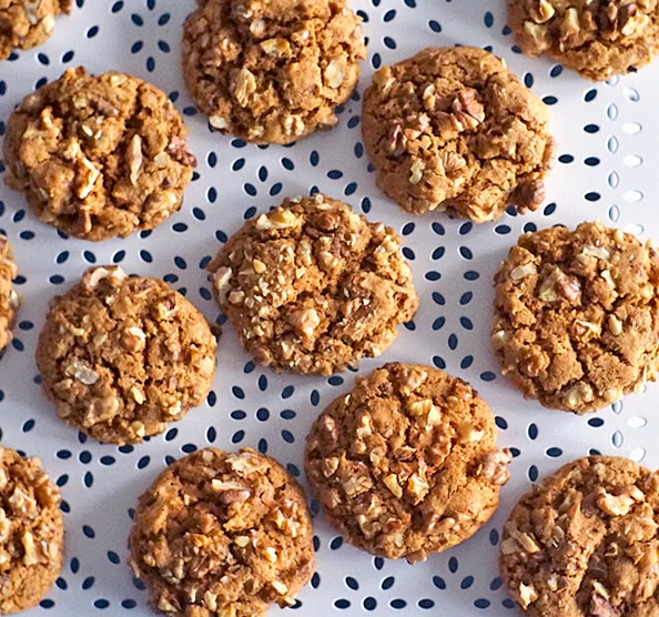 Já vím, říkáte si Jééé, sušenky, trapný a suchý! Asi by mě to taky napadlo... Ale bacha! Tyhle sušenky nejsou nějaké obyčejné drobivé placky, ale naprosto super duper chutné šťavnaté rumovo-karamelové sušenky s opraženými ořechy. Kdybych měla kavárnu, určitě by nechyběly v nabídce. Tak se nechte přesvědčit - výsledek, ve kterém se (jak by řekl Josef Václav Sládek nebo nějací nechutní gourmet foodies) snoubí chuť melasy, rumu, hnědého cukru, opražených ořechů a muškátového oříšku za to vážně stojí. Díky Veganomiconu za ně!